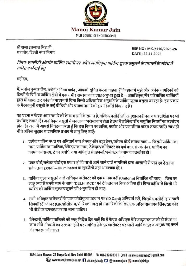 दिल्ली के कई एमसीडी पार्किंग स्थलों पर अनधिकृत व्यक्तियों द्वारा गैरकानूनी रूप से QR कोड के माध्यम से पार्किंग शुल्क वसूले जाने की शिकायतें लगातार बढ़ रही हैं। यह न सिर्फ़ नागरिकों से ठगी है, बल्कि एमसीडी की प्रणाली और अनुशासन पर भी गंभीर प्रश्नचिन्ह खड़ा करती है।