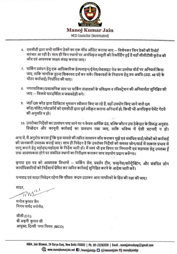 दिल्ली में अवैध पार्किंग वसूली पर सख़्त कार्रवाई की मांग।